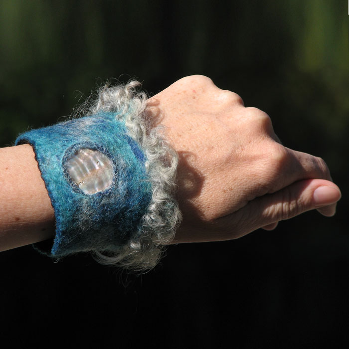 Filzarmband mit Gotlandlockenrand und eingefilzter Perlmuttscheibe